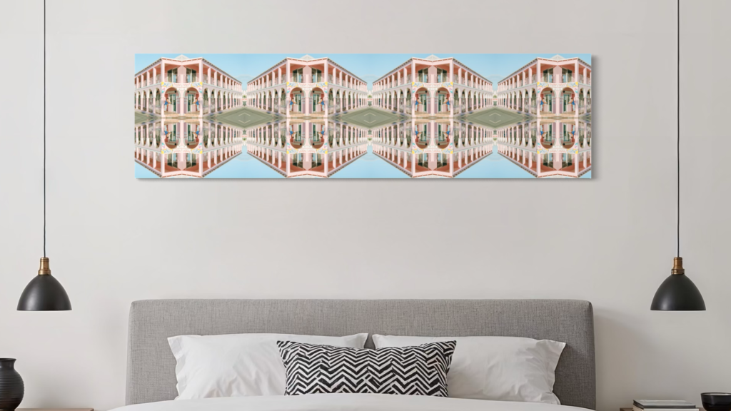 Mixed media work examining repetition, symmetry, and perception through architectural form. By mirroring and multiplying a single structure, the image dissolves fixed orientation and scale, transforming a familiar streetscape into a patterned field. The work reflects how place and culture can be reshaped through repetition, memory, and visual rhythm.